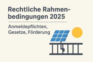 - Rechtliche Rahmenbedingungen 2025 – Anmeldepflichten, Gesetze, FörderungEinleitung Wer überlegt, ein Balkonkraftwerk zu installieren, begegnet früher oder später der Frage: Was ist rechtlich erlaubt? Welche Pflichten gibt es bei Anmeldung, welche Gesetze …